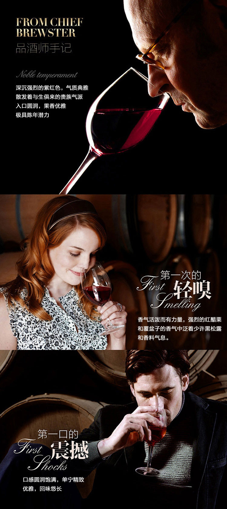 木桐紅葡萄酒以赤霞珠葡萄為主,根據(jù)年份不同,加入不同比例的品麗珠,梅樂和味而多。木桐紅酒具有典型的赤霞珠特征,成熟的黑加侖子果味,咖啡,烤木香氣,單寧味十分勁道,需在瓶中陳年7——15年方可以引用,是世界頂級收藏酒之一。木桐堡不同年份的酒都具有熟美的黑色漿果香,豐滿的口感,經(jīng)典的煙熏氣,形成非常獨特的‘木桐香氣’,令人一聞便知是是木桐酒。