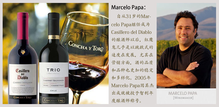 自從31歲的Marcelo Papa繼任成為Casillero del Diablo的釀酒師以后,紅魔鬼幾乎是以跳躍式的速度在發展,尤其在營銷方面,酒的品質和品種,也更加的穩定和多樣化。