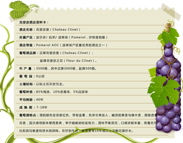 在釀酒方面,葡萄全經人手采摘之后放入大木桶中發酵,木桶帶有溫控系統,發酵與浸漬期持續四周,用100%全新橡木桶熟成,不經澄清過濾,24個月后裝瓶。正牌“克里奈城堡”產量約3000箱,副牌Fleur de Clinet每年約500箱。