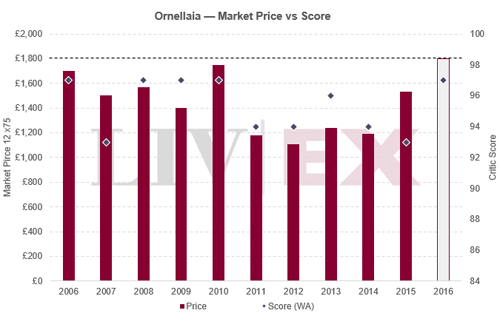 2016年份奧納亞干紅葡萄酒(Ornellaia)已于周三早上由英國酒商發(fā)布,每箱(12×75)售價(jià)為1,800英鎊;此酒在歐洲隨即已有交易,美國著名葡萄酒雜志——葡萄酒倡導(dǎo)家(Wine Advocate)的莫妮卡·拉娜(Monica Larner)給此酒在桶96-98分,評(píng)它 “柔和、多汁和具結(jié)構(gòu),十分平衡,令人贊嘆。“