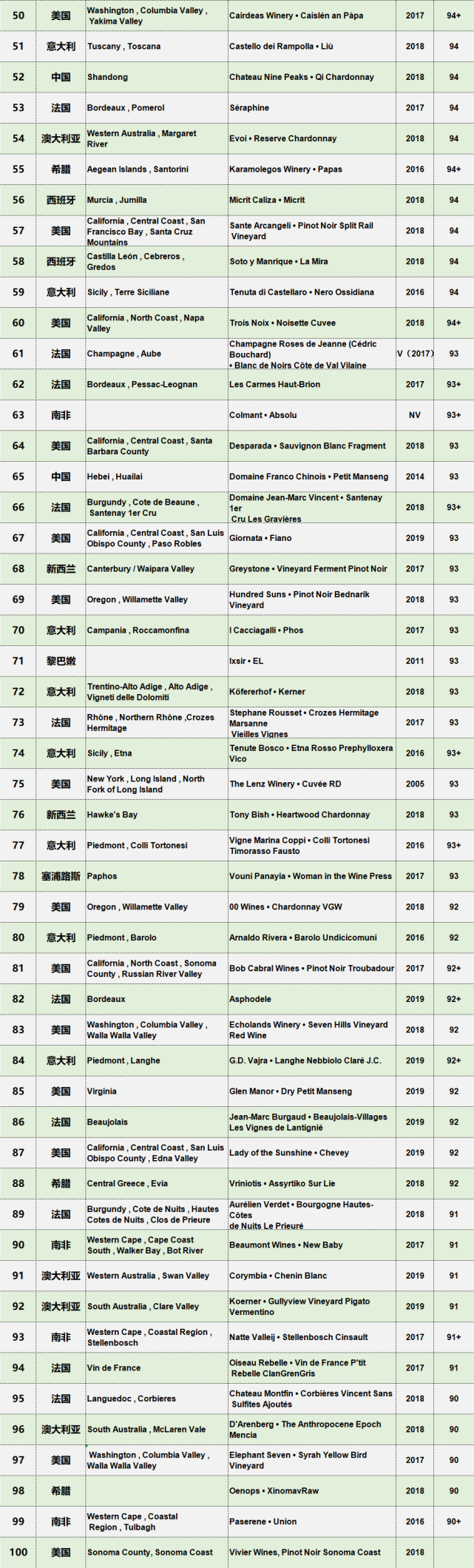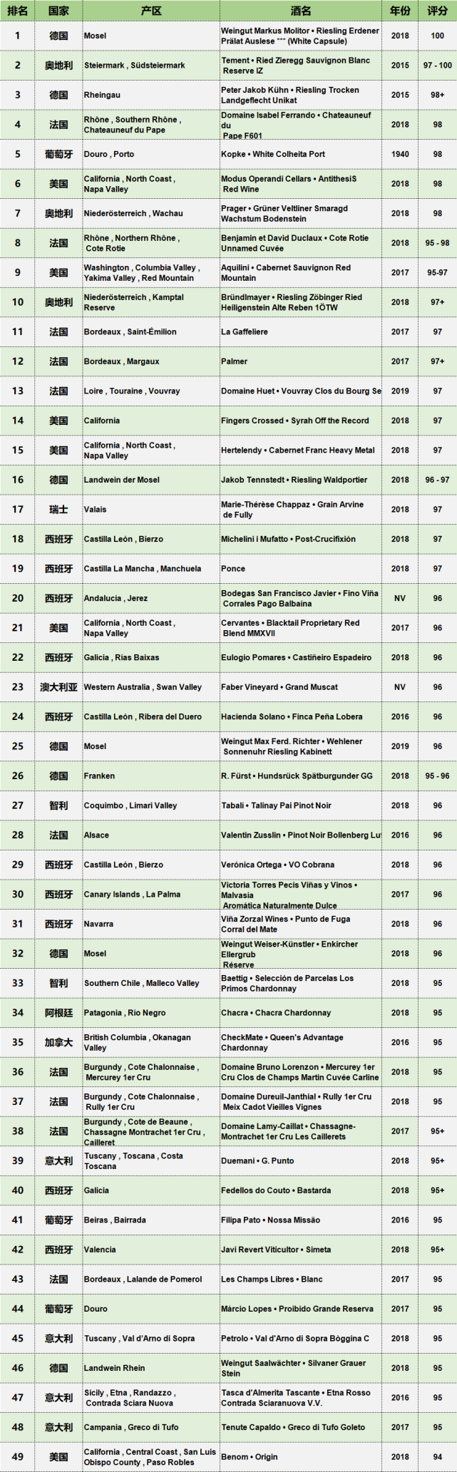 葡萄酒倡導家2020年百強葡萄酒詳細榜單如下圖:
