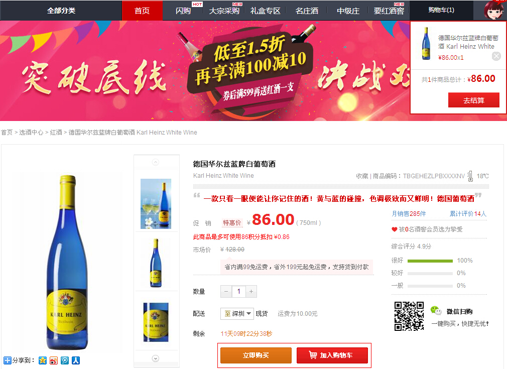 (1) 在商品詳情頁,可以點(diǎn)擊“立即購買”按鈕將商品加入到購物車,然后可以選擇去結(jié)算也可以繼續(xù)購買;